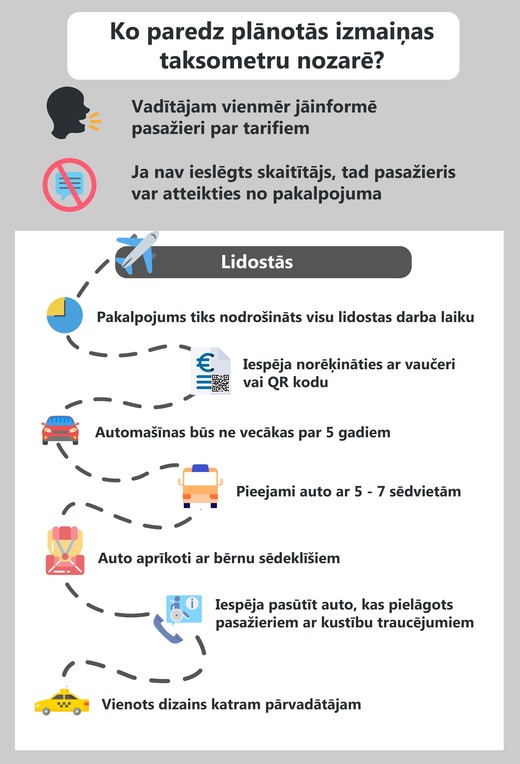 Likumprojekts paredz, ka starptautiskas nozīmes infrastruktūras objektos pārvadātājam būs jānodrošina viens tarifs taksometra nolīgšanai, vienam kilometram un vienai minūtei. Likums noteiks arī iespēju norēķināties par braucienu ar priekšapmaksas dokumentu, piemēram, kuponu vai QR kodu. Jaunā kārtība paredzēs arī to, ka pārvadātājam pakalpojuma pieejamība objektos būs jānodrošina visu to darbības laiku. Tāpat transportlīdzekļiem būs jāatbilst noteiktām kvalitātes prasībām, piemēram, tie nedrīkstēs būt vecāki par pieciem gadiem, tiem būs jānodrošina iespēja pārvadāt bērnus, kā arī cilvēkus ar kustību traucējumiem.