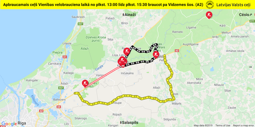 Apbraukšanas ceļi laikā no 13:00 līdz 15:30 tiks organizēta šādi: