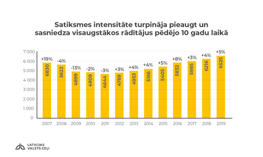 Kopš 2011. gada satiksmes intensitāte ik gadu turpina pastāvīgi augt un pērn tā sasniedza visaugstākos rādītājus pēdējo 10 gadu laikā.