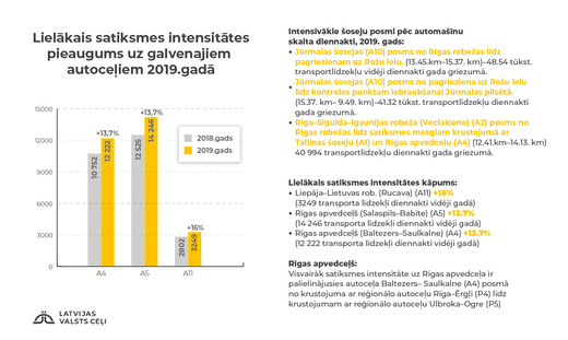 Viss blīvākā satiksme koncentrējas uz valsts autoceļiem Pierīgā: uz Rīgas apvedceļa A4 (Baltezers–Saulkalne) – 12 222 un uz Rīgas apvedceļa A5 (Salaspils–Babīte) – 14246 autotransporta vienības vidēji diennaktī uz ceļa kilometru. Kā arī par 16% pieaugusi satiksmes intensitāte uz autoceļa Liepāja - Lietuvas rob.(Rucava) (A11), kur vidēji diennaktī uz ceļa kilometru 2019. gadā bija 3249 autotransporta vienības.