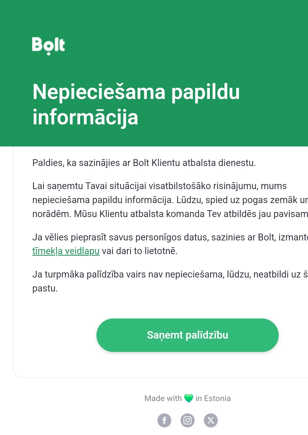 "Esmu atteicies no Bolt pakalpojumiem un jau vairākus mēnešus kā dzēsis Bolt aplikāciju, tā kā pārdzīt traucējoši novietoto auto pat teorētiski nebija iespējams. Viens no iemesliem, kāpēc dzēsu Bolt, ir sliktais klientu serviss un problēmu gadījumā vienkārši nav tālruņa numura, ar kuru, piemēram, šajā gadījumā varētu sazināties ar Bolt."