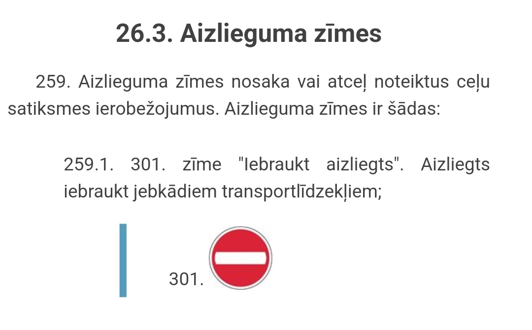 259.1. 301. zīme "Iebraukt aizliegts". Aizliegts iebraukt jebkādiem transportlīdzekļiem; Neattiecas uz sabiedrisko transportu. Foto: Ekrānuzņēmums no CSN