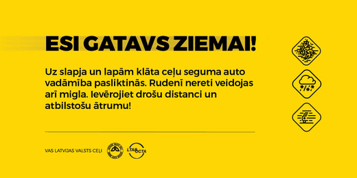 Saskaņā ar meteorologu prognozēm šovakar vietām turpināsies lietus un saglabāsies dūmaka, bet naktī un no rīta Vidzemē un Latgalē autoceļi var apledot. Aicinām autovadītājus būs piesardzīgiem uz autoceļa. Īpaši tas attiecas uz ceļiem, kas iet cauri mežiem vai gar ūdenstilpnēm, kā arī uz tiltiem un pārvadiem. Lasīt vairāk