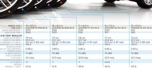 Ja joprojām esat tik naivi, lai domātu, ka viss tā sauktais „tehnikas progress” no tā virzītāju puses ir nesavtīgs un godīgs – maz jūs mazlietiņ žēl. Turpiniet maksāt par vienu no spilgtākajiem 21. gadsimta auto pseidouzlabojumiem, kurš izņemot skaistumu (manuprāt – apšaubāmu) nedod neko. Ja nepietiek ar manu personīgo pieredzi un viedokli – pavandieties internetā. Tur var atrast, piemēram, autoritatīva izdevuma „Car and Driver” (ASV, Kalifornija) vērienīgu testu, kurā dažādos veidos dzenāts VW „Golf’ ar riteņiem sākot no standarta 195/65 15 līdz pat 19 collu 35 procentiem. Visos testa rādītājos, izņemot šķērsstabilitāti pagriezienā (kur rezultāts ir 0,83 pret 0,87) un bremzēšanu (130 pēdaas pret 126), uzvar standarta riepas. Tās ir ātrākas ieskrējienos, tās ir klusākas, tās – protams – ir taupīgākas degvielas patēriņā (ja īpaša interese par skaitļiem, variet mēģināt tos salasīt pievienotajā prezentācijas slaidā).