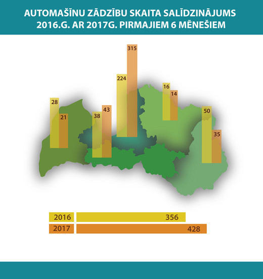 Kā liecina Valsts policijas Kriminālizmeklēšanas pārvaldes 2.nodaļas darbinieku apkopotā informācija, salīdzinot ar pērnā gada pirmo pusi, šī gada pirmajos sešos mēnešos automašīnu zādzību skaits ir nedaudz pieaudzis. Kopā šī gada sešos mēnešos reģistrētas 428 spēkratu zādzības, bet pērn šajā pat laika posmā – 356. Tiesa, lielāko pieaugumu automašīnu zādzību skaitā var novērot Rīgas reģionā – šogad sešos mēnešos fiksētas 315 automašīnu zādzības, kas ir par 91 vairāk nekā pērn – 224.