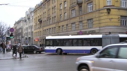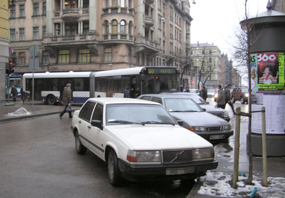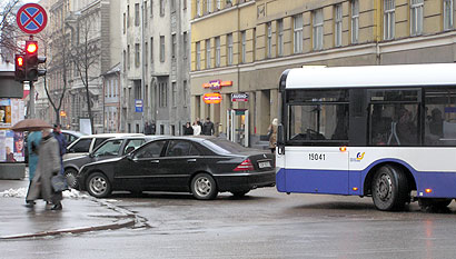 Uz Brīvības un Stabu ielas krustojuma bija "iestājies" sastrēgums. Satiksmes autobuss, braucot pa savu maršrutu, mēģināja veikt labo pagriezienu no Brīvības uz Stabu ielu.