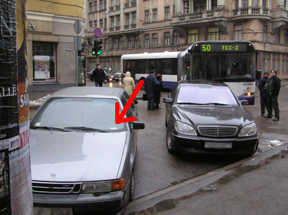 Drīz (apmēram pēc 40 minūtēm kopš sastrēguma sākuma) ieradās Volvo vadītājs un klusiņām aizbrauca, pēc tam ieradās Mercedesa īpašnieks, pabrauca nedaudz uz priekšu un tad "ilgstoši" un ļoti visiem atvainojās, aizbildinoties, ka ticis steidzami izsaukts uz "stabeni". Un vispār - "vai tad šeit nedrīkstot stāvēt?" Kamēr viņš tā atvainojās, parādījās municipālā policija, kas kautrīgi sāka "fiksēt situāciju" - fotografēt nepareizi novietotos auto.