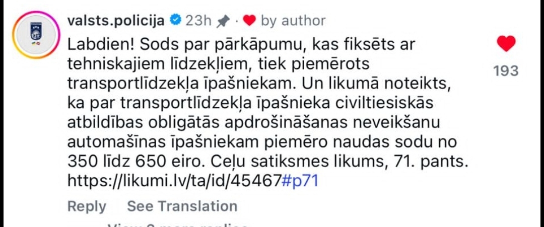 Autosportists Reinis Ozoliņš sociālajos tīklos jautā Valsts policijai! Paldies par skaisto foto - tiešām labs kameras leņķis Varu palūgt komentāru: kāpēc par braucienu bez OCTA (mana kļūda, neargumentēju) automātiski tiek piemērots MAX sods 350€, ja likums paredz diapazonu 85-350€?