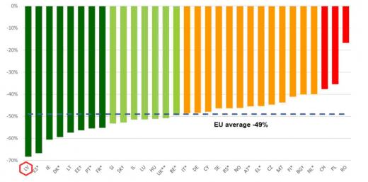 Salīdzinājums par ceļu satiksmes negadījumos bojā gājušo skaita samazinājumu Eiropā, %, 2001.-2012.gads