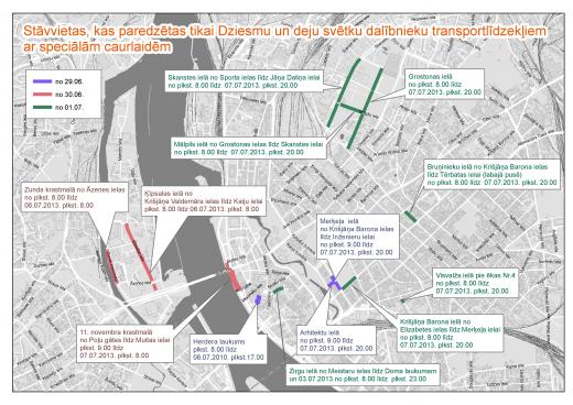 Savukārt no 05.07.2013. no plkst. 15.00 līdz plkst. 18.00, 06.07.2013. no plkst. 7.00 līdz plkst. 24.00, 07.07.2013. no plkst. 7.00 līdz plkst. 24.00 un 07.07.2013. no plkst. 17.00 līdz 08.07.2013. plkst. 7.00 ierobežos vai slēgs transportlīdzekļu satiksmi (izņemot transportlīdzekļus ar organizatoru izsniegtajām speciālām caurlaidēm un sabiedriskā transporta satiksmi un vietējo iedzīvotāju transportlīdzekļus):
