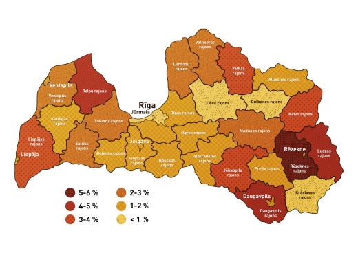 Arī šogad vērojama iepriekšējo gadu tendence, ka pilsētās neapdrošinātu transportlīdzekļu izraisītu avāriju īpatsvars ir mazāks nekā novados. Savukārt Rīgā un Rīgas rajonā, kurā ir vērojama vislielākā transportlīdzekļu plūsma, kā arī reģistrēto transportlīdzekļu skaits, neapdrošināto spēkratu izraisīto avāriju īpatsvars nepārsniedz 1 - 2 % robežu.