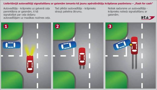 Apdrošināšanas sabiedrības „BTA Insurance Company” SE (turpmāk – BTA) Apvienotās Karalistes filiāles darbinieki brīdina par jaunu apdrošinātāju krāpšanas paņēmienu Lielbritānijā. Signalizējot ar tuvajām un tālajām gaismām, krāpnieki maldīgi rada priekšstatu, ka dod priekšroku autovadītājam, kurš vēlas izbraukt uz galvenā ceļa no mazākas nozīmes ceļa. Tuvojoties krustojumam, apzināti, ar mērķi saņemt apdrošināšanas atlīdzības, tiek izraisītas sadursmes. Negodprātīgo autovadītāju „izgudrojums” Lielbritānijā nodēvēts par „flash for cash” jeb „zibsnīšana naudas iegūšanai”.