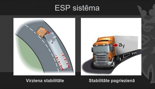 Kopš pērnā gada nogales atbilstoši likumdošanas prasībām visi Scania spēkrati ir aprīkoti arī ar elektroniskās stabilitātes sistēmu (ESP), kura kritiskā situācijā, piemēram, braucot pa slapjiem un slideniem ceļiem, kā arī uz sausiem ceļiem, ja ir bīstamība, ka mašīna var apgāzties, palīdz autovadītājam saglabāt kontroli pār transportlīdzekli. Kad sistēma nosaka kādas atšķirības starp autovadītāja dotajām komandām, virzienu, kurā autovadītājs grib virzīt mašīnu un automašīnas aktuālo kustības virzienu, tā nekavējoties aprēķina katra priekšējā, aizmugurējā un piekabes riteņa bremzēšanas spēku, kā arī samazina degvielas padevi (atlaiž gāzi), tā palīdzot autovadītājam stūrēt automašīnu izvēlētajā virzienā. Kā izvēles aprīkojums ESP bija pieejams kopš 2007. gada.