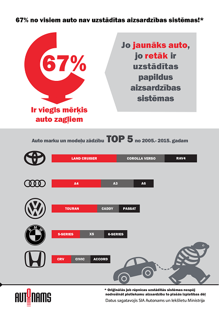 SIA Autonams veiktajā 1 gada un 3 mēnešu garajā pētījumā, kurā tika pārbaudīti 3339 riska grupas auto, vecumā līdz 10 gadiem, tika noskaidrots, ka divas trešdaļas no automašīnām var kļūt par vieglu mērķi potenciālajiem zagļiem.