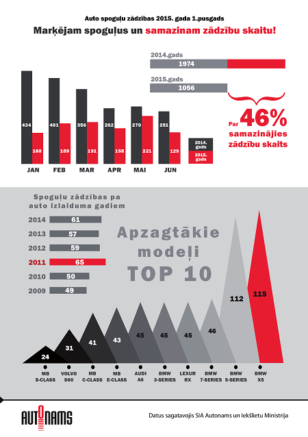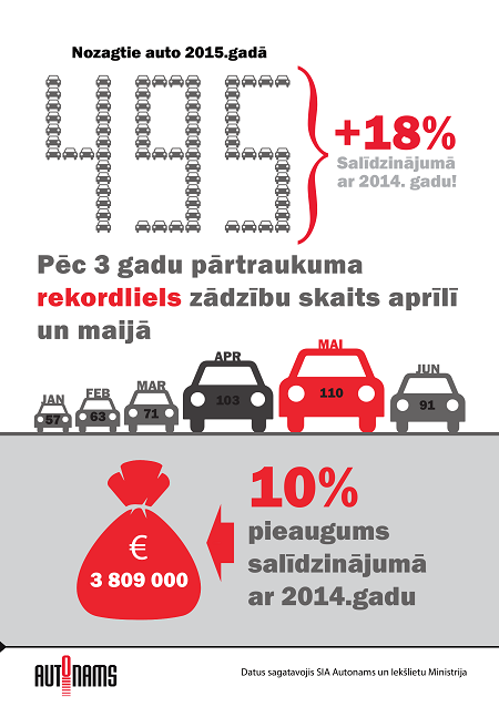 Šī gada pirmajā pusgadā tika nozagtas 495 automašīnas, 3 809 000 EUR vērtībā, kas ir 10% pieaugums salīdzinot ar 2014. gada tādu pašu periodu. Lai arī automašīnas, kas, ražotas līdz 2005. gadam, tika nozagtas par 17 vairāk, kā 0 līdz 10 gadus vecas automašīnas, naudas izteiksmē jaunāku auto zādzības ir daudzkārt lielāks zaudējums, veidojot 3 402 000 EUR zaudējumus pirmajā pusgadā, kur automašīnas vecākas par 2005. gadu veidoja 407 000 EUR zaudējumus.