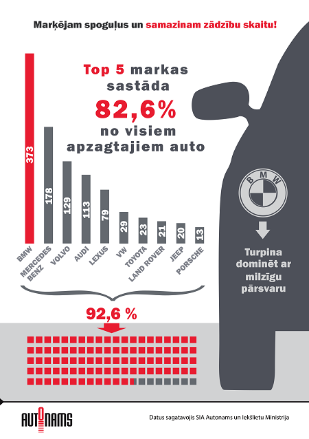 Kā ierasts ar lielu pārsvaru topa augšgalā atrodas BMW markas automobiļi ar 373 apzagtām automašīnām, kam seko MERCEDES BENZ (178), VOLVO (129) un AUDI (113), un apzagtāko auto top5 noslēdz LEXUS ar 79 apzagtām automašīnām.