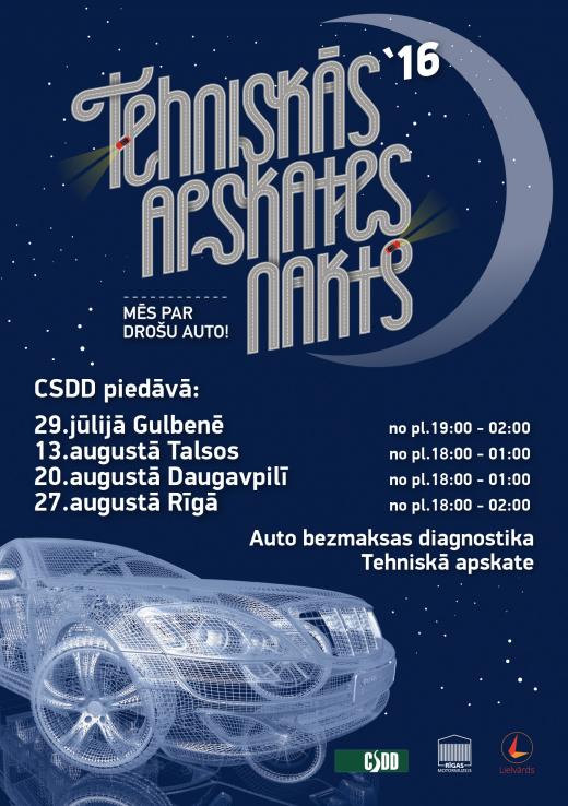 Ņemot vērā autovadītāju lielo interesi, Latvijas autoparka īpatnības un braukšanas apstākļus, Ceļu satiksmes drošības direkcija (CSDD) jau piekto gadu piedāvā bezmaksas vieglo transportlīdzekļu diagnostiku pasākumā "Tehniskās apskates nakts".