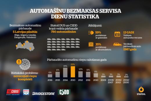 Pasākumos, kuri norisinājās Statoil degvielas uzpildes stacijās un pie tirdzniecības centriem Rīgā, bija iespēja uzdot jautājumus kvalificētiem auto aprūpes speciālistiem un saņemt informāciju par mūsdienīgu auto diagnostiku, apkopi un uzturēšanu. Interesanti, ka vidējais Latvijas autoparka vecums ir 13 gadu, bet vecākais šajās servisa dienās pārbaudītais auto ražots 1987. gadā un tam bija uzstādītas 2000. gada izlaiduma riepas.
