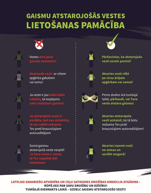 Lai arī ik gadu pie cilvēkiem nonāk vairāki tūkstoši gaismu atstarojošo vestu, tomēr vēl aizvien ir gadījumi, kad cilvēki aizmirst uzvilkt vesti vai to lieto nepareizi. Piemēram, reģionālo reidu laikā kāda sieviete atzinās, ka viņai veste ir, bet tā tiek nēsāta rokassomiņā. Savukārt cits gājējs uzvelk vesti, bet tai pa virsu uzliek mugursomu. Tieši tādēļ CSDD un Latvijas Samariešu apvienība ir sagatavojusi īsu apkopojumu – kā pareizi nēsājama veste.