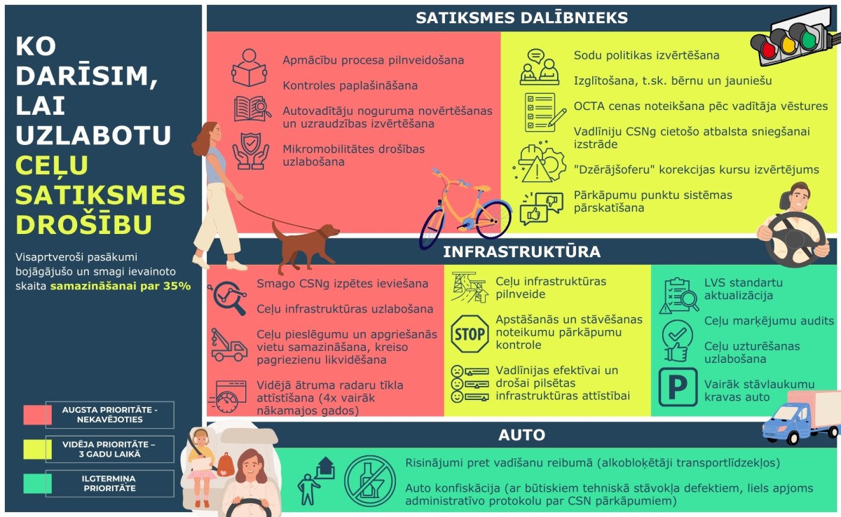 Lai samazinātu CSNg smagi ievainoto un bojāgājušo personu skaitu 2027. gadā par 35% sasniegšanai, papildus jau veiktajiem pasākumiem nepieciešams īstenot virkni jaunu pasākumu Informatīvajā ziņojumā ir ietverti priekšlikumi, kas sadalīti trīs līmeņos – augstas prioritātes pasākumi, kas jāīsteno nekavējoties, vidējas prioritātes pasākumi, kas jāīsteno tuvāko trīs gadu laikā un ilgtermiņa prioritārie pasākumi, kuru īstenošana paredzēta ilgākā laika posmā. Pasākumus plānots nodrošināt trīs virzienos - drošs ceļu satiksmes dalībnieks, drošs transportlīdzeklis un droša vide, un tam nepieciešams 1,1 milj.eiro papildu finansējums no Ceļu satiksmes drošības padomes līdzekļiem (apdrošinātāju veiktie maksājumi CSNg novēršanas pasākumu veikšanai).