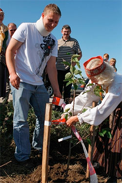 Ievērojot tradīciju, Krievijas rallistu ekipāža Jevgeņijs Šklajevs/ Konstantīns Ogarko Vecpilī stādīs ķirsīti, ko viņi nolauza 2010.gada rallijā „Kurzeme”.