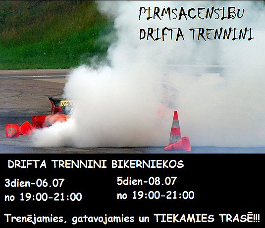 Šo trešdien 6.jūlijā, kā arī piektdien 8.jūlijā plkst. 19.00-21.00 tiek rīkots street, PROam un PRO drifta treniņš.