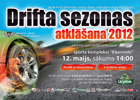 Pēc aizvadītās bargās ziemas, beidzot varam paziņot, ka jau šajā nedēļas nogalē atklāsim 2012. gada drifta sezonu. Pirmās sacensības notiks stadionā, trase - atkal kas jauns, būs arī ātrums un protami daudz dūmi, agresīvas cīņas un uz starta daudz jaunu dalībnieku, vai jau zināmie dalībnieki ar ko jaunu, pārbūvētu u.t.t.