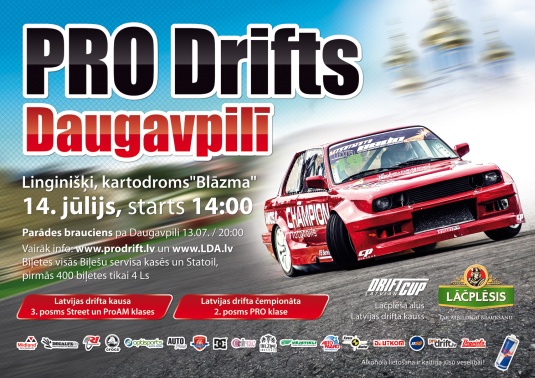 • Latvijas Drifta čempionāta 2.posms ar PRO klases ieskaiti, kur uz starta redzēsim gan divkārtējo Latvijas drifta čempionu Jāni Eglīti, gan visus pārējos PRO klases braucējus, kas veiksmīgi sevi pieteica un parādīja pirmajā LDČ posmā Rīgā