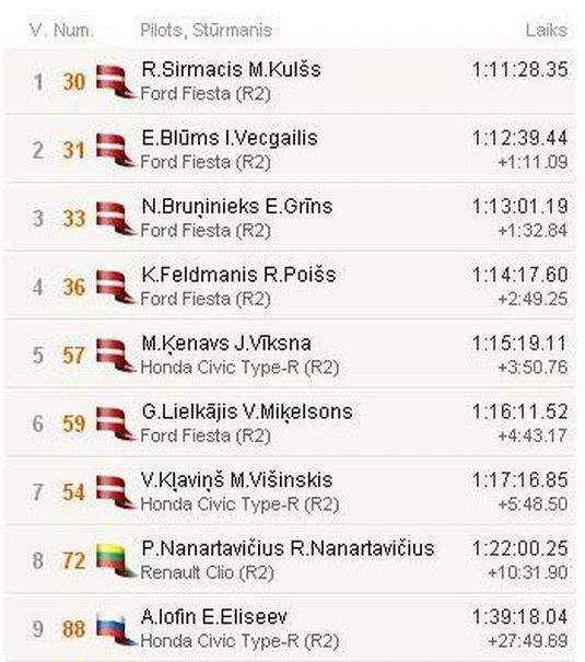 Perfektu ralliju Apes un Gulbenes apkārtnē aizvadīja pērnā gada Latvijas čempioni R2 klasē un šī gada čempionāta līderi Ralfs Sirmacis / Māris Kulšs. Triumfējot deviņos no desmit rallija ātrumposmiem, Sirmacis dienas beigās tuvāko sekotāju apsteidza par vairāk nekā minūti. Otro pozīciju ieņēma Emīls Blūms / Ilmārs Vecgailis, kurš visu sacīkstes laiku aizvadīja lielisku cīņu ar Nauri Bruņinieku / Edgaru Grīnu. Galu galā pārāks bija Blūms, sāncensi apsteidzot par 21,75 sekundēm.