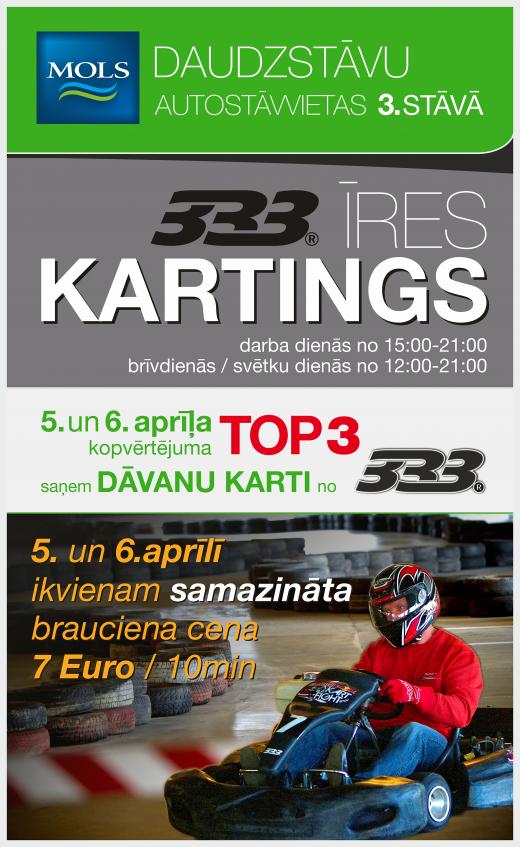 5. un 6.aprīlī tiek dots starts jaunajai kartinga sezonai. Tirdzniecības centra „Mols” daudzstāvu autostāvvietas 3.stāvā otro gadu pēc kārtas līdz vēlam rudenim ikvienam interesentam būs iespējas sēsties pie kartinga stūres. Jaunās 333 kartinga trases garums ir 450m, un vidējais trases apļa veikšanas ātrums ir 18sec. Trases izveidē ir izmantotas 1000 vieglo automašīnu riepas.