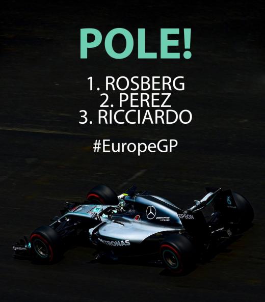 Rosbergs savu ātrāko apli veica minūtē un 42,758 sekundēs, bet otro vietu izcīnīja "Force India" meksikāņu pilots Serhio Peress, kurš bija par 0,757 sekundēm lēnāks. Identiskus apļa laikus uzrādīja "Red Bull" austrāliešu pilots Daniels Rikjardo un četrkārtējais pasaules čempions Sebastjans Fetels no "Ferrari", kuri rītdien startēs no otrās starta rindas.