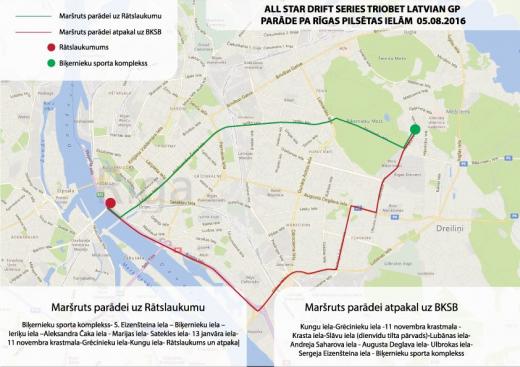 Drift Allstars Rīgas posms iesāksies ar treniņiem piektdienā, 5. augustā. Tie ilgs no 13:00 līdz 19:00, ieeja būs 3 eur, pēc kuriem sekos iespaidīgā drifta automašīnu parāde pa Rīgas ielām. Tā startēs 19:30 no Biķernieku trases un pa Biķernieku, Ieriķu un Aleksandra Čaka ielām vedīs uz pašu Rīgas sirdi, t.i. Rātslaukumu. No 20:00 līdz 20:40 jaudīgie drifta spēkrati būs apskatāmi Rātslaukumā, savukārt pēc tam automašīnu kolonna pa krastmalu dosies atpakaļ uz Biķerniekiem.