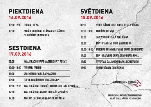 Organizatori aicina skatītājus apmeklēt abas dienas, jo dienas kārtība ir saplānota tā, lai tā ritētu raiti un būtu interesanta, beidzoties Polijas seriālam sestdienas pēcpusdienā notiks Latvijas drifta čempionāta atsevišķi kvalifikācijas braucieni, bet svētdienā atsevišķi tandēmu braucieni, jāpiemin, ka Latvijas drifta čempionāts brauks pa citu trases konfigurāciju kā Drift Masters seriāls. Tātad svētdienā būs iespējams redzēt 2 atsevišķus tandēmu finālus, divās dažādās trases konfigurācijās.