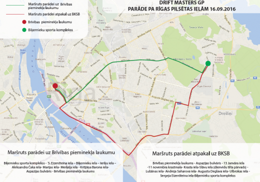 Drifta parāde sāksies piektdienas vakarā 19:00 no Biķernieku sporta kompleksa. Tālākais maršruts ir pa Biķernieku ielu- Ieriķu ielu- Aleksandra Čaka iela-Marijas iela- Merķeļa iela- Krišjāņa Barona iela- Aspazijas Būlvāris- Brīvības pieminekļa laukums, aptuvenā ierāšanās tur plānota ap 19:20-19:30