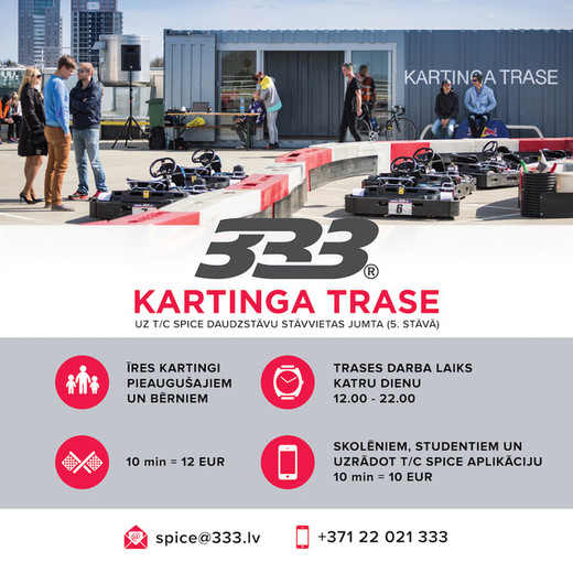 “333 Spice” ir Latvijā unikāla kartingu trase, jo tā izvietota uz daudzstāvu autostāvvietas jumta (5.stāvā), un braucieni norisinās vienā līmenī ar ēku jumtiem. Šogad “333 Spice” trasē ir paplašināts kartingu parks - vienlaikus būs pieejami astoņi pieaugušo un divi bērnu kartingi.