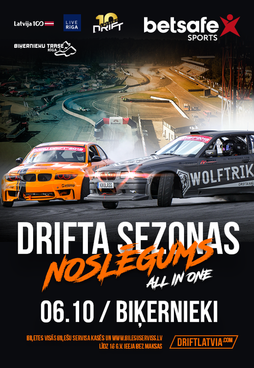 Betsafe drifta sezona noslēgsies jau šajā nedēļas nogalē, 6.oktobrī, Biķerniekos, uz starta izies visas 3 drifta klases, bet šoreiz, drifts notiks vienlaicīgi divās vietās, Latvijas drifta kausa street klase savas sacensības aizvadīs Biķernieku spīdveja stadionā, bet Proam un Pro klases savus startus aizvadīs Biķernieku lielās trases konfigurācijā ar jaunu papildus līkumu trases beigās.