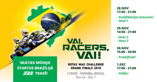 No 28. novembra līdz 1. decembrim sporta kompleksā “333” būs iespēja kopīgi skatīties latviešu braucēju startus Brazīlijā, Rotax Max Challenge Grand Finals sacensībās!