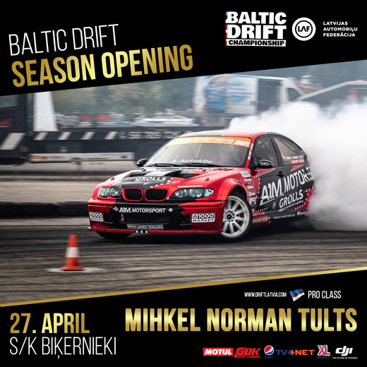 27. aprīlī, Biķerniekos, notiks Baltijas drifta čempionāts, kur satiksies Latvijas, Igaunijas un Lietuvas Pro drifta čempionātu dalībnieki, kā arī visu valstu PROam klases braucēji. Šajā dienā uz starta redzēsim visus labākos PRO klases braucējus, gan iepriekšējā gada Baltijas čempionu Ēriku Ulasu, gan Ingusu Jēkabsonu, igauni Mihkel Norman Tults, lietuvieti Benediktas Čirba, iepriekš izziņoto sievieti- Krisse Alto un citus. Organizatori uzsver, ka iespējams vēl paredzēti pārsteigumi dalībnieku sastāvā, tas tiks zināms nākamnedēļ. Sacensības 27.aprīlī iesāksies plkst. 14.00 ar oficiālo atklāšanas ceremoniju, kam sekos abu klašu tandēmu TOP32. Skatītāji ir aicināti sacensībās ierasties jau no 09:00, ja ir interese sekot līdzi arī kvalifikācijas braucieni norisei.