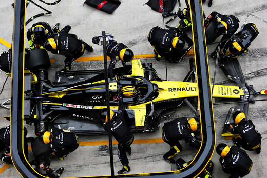 2019.gadā F-1 kalendārā ir 21 sacīkstes, kas notiek visos 5 kontinentos. Reportāžas tiek pārraidītas uz 180 valstīm, kur tās noskatās apmēram 450 miljoni skatītāju. Uz katru posmu dodas 70-90 cilvēku liela "Renault" komanda ar 60 tonnām ekipējuma. Sezonas laikā šī komanda ceļo apmēram 160 tūkstošus kilometru. Pēc FIA noteikumiem, tikai 60 komandas locekļiem ir atļauta piekļuve sacīkšu mašīnām. Viņi spēj F-1 mašīnu pilnībā izjaukt un salikt no jauna 8 stundu laikā, bet dzinēju nomainīt tikai 60 minūtēs. Pēc katras sacīkstes apmēram 500 detaļu atgriežas Enstonā, kur tām tiek veikta rūpīga ekspertīze.