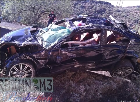 Automašīnai piestiprinātā video kamera uzfilmējusi BMW M3 (E46) dzīves pēdējos mirkļus – joņošana pa kalnu ceļu beidzas ar pilota kļūdu, pēc kuras BMW ar visu šoferi aizkūleņo lejup pa nogāzi.