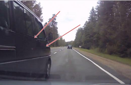 Video autors sūdzas par "Volkswagen" busiņu, kas atgriežoties savā joslā aizskar viņa automobili un izraisa tā noskriešanu no ceļa (skatīt no 0:20)