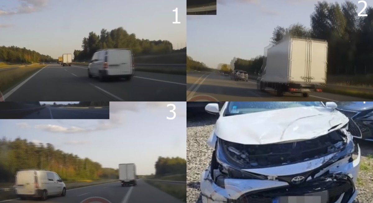 Video autors avarē, jo mēģinot izvairīties no Mercedes busiņa, kurš iebrauc viņa joslā, zaudē kontroli pār savu Toyota. Busiņa vadītājs savu vainu neatzīst, taču pēc policijas pieprasījuma samaksā 3000 zlotu (aptuveni 675 eiro) sodu. Lasīt vairāk