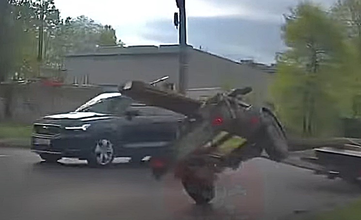 Mazā kravinieka šoferis, kas ar vienasu piekabes palīdzību transportē negabarīta metāla stieņus, pieļauj piekabes riteņu uzbraukšanu uz apmales, kā rezultātā krava apgāžas un ieslīdot pretējā joslā, sabojā pretimbraucošo VW Golf. Lasīt vairāk