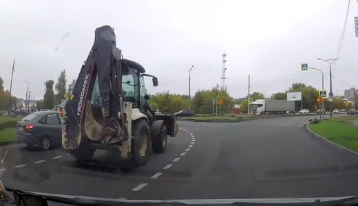 Izbraucot no satiksmes apļa, vieglais auto aizķeras aiz ekskavatora kausa. Lasīt vairāk