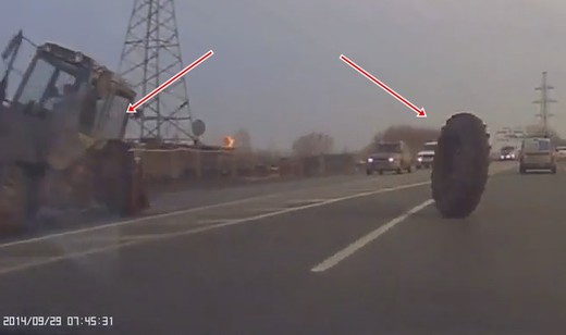 Autovadītājai laimīgā kārtā izdodas izvairīties no milzīgā riteņa, ko pazaudē pretimbraucošā traktortehnika. Lasīt vairāk
