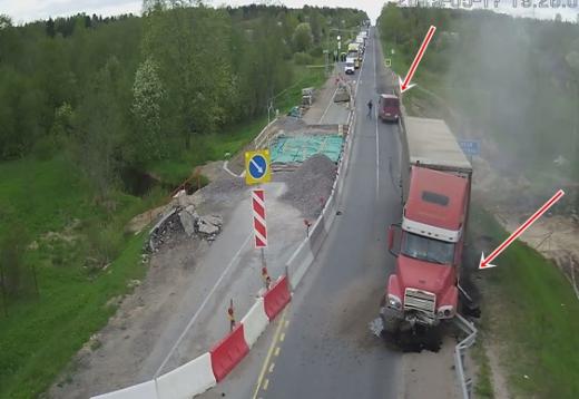 Video, kas apceļojis pasauli pēdējo 24 stundu laikā. Mediji pasniedz vismaz divas versijas: 1) kravas auto nevēlas gaidīt rindas galā un nolemj izmantot brīdi, kamēr neviens nebrauc pretī, 2) kravas auto bojātas bremzes (krievu versija) un no lielākas traģēdijas glābj barjeras, kas aptur ripot uzsākušo smagsvaru. Lasīt vairāk