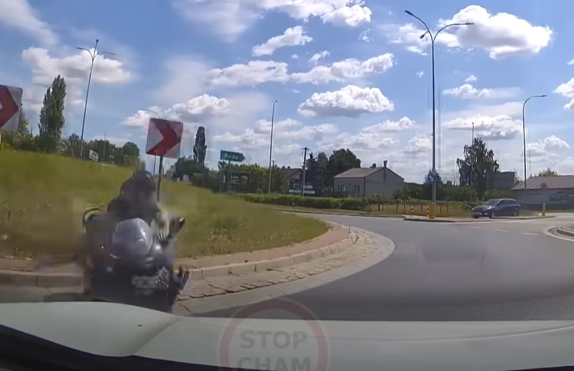 Motociklists neierakstās apļveida krustojumā un pārbraucot tam pāri, uztriecas filmētāja Honda. Komentārā teikts, ka motociklists bēdzis no policijai. Lasīt vairāk