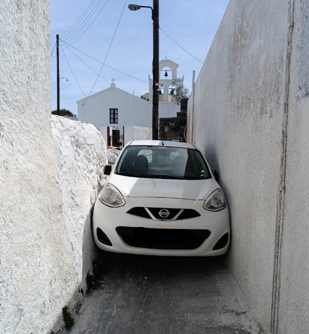 Nissan Micra vadītāja mēģinājums izbraukt pa šauru ieliņu Grieķijai piederošajā Santorini salā beidzies ar neveiksmi.