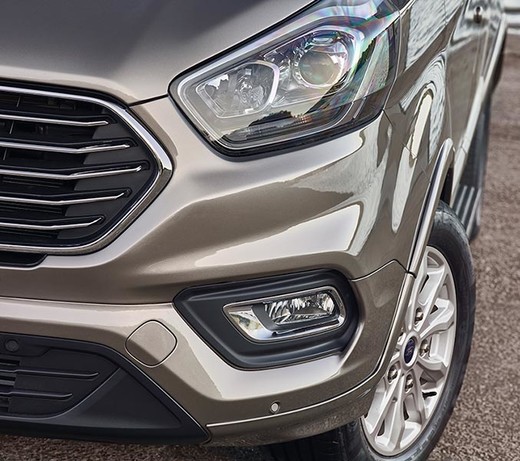 Jaunajam Tourneo Custom ir jauns, izteiksmīgs priekšējās daļas dizains, kam ir vienādi gēni ar Ford jaunākajiem pasažieru pārvadāšanas automobiļiem – tam ir augstu novietota trapeces formas reste un dinamiski, slaidi priekšējie lukturi, kas gaumīgi ievirzās automobiļa vīrišķīgajās plecu līnijās.