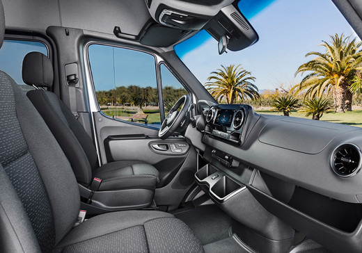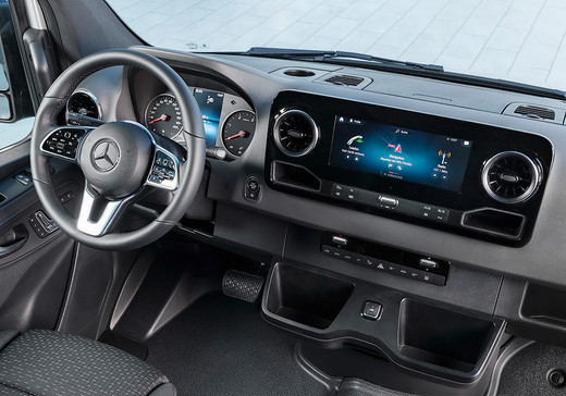 Visdārgākajā aprīkojuma versijā Sprinter stūre līdzināsies S-klases limuzīnā redzētajai – tā būs smalki nostrādāta, komplektēta ar skārienjutīgās vadības sekcijām un pogām, ventilācijas/apsildes izvadiem būs hroma apmalīte, bet multimediju sistēmas ekrāna izmērs pieaugs līdz 10,25 collām.